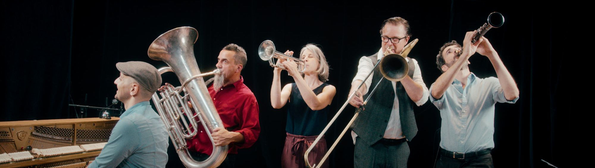 Chant, trompette, clarinette, saxophone, trombone, piano, tuba et claquettes, sont les instruments qui composent le petit orchestre acoustique, qui partage sa passion pour le jazz traditionnel avec fraîcheur et bonne humeur.